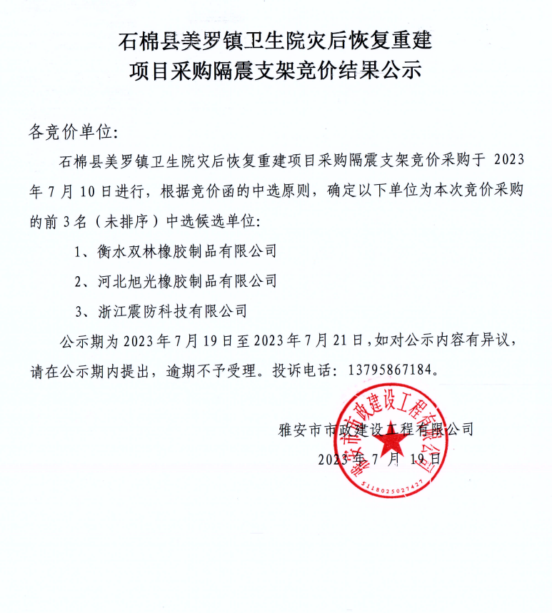 石棉縣美羅鎮(zhèn)衛(wèi)生院災后恢復重建項目采購隔震支架競價結果公示