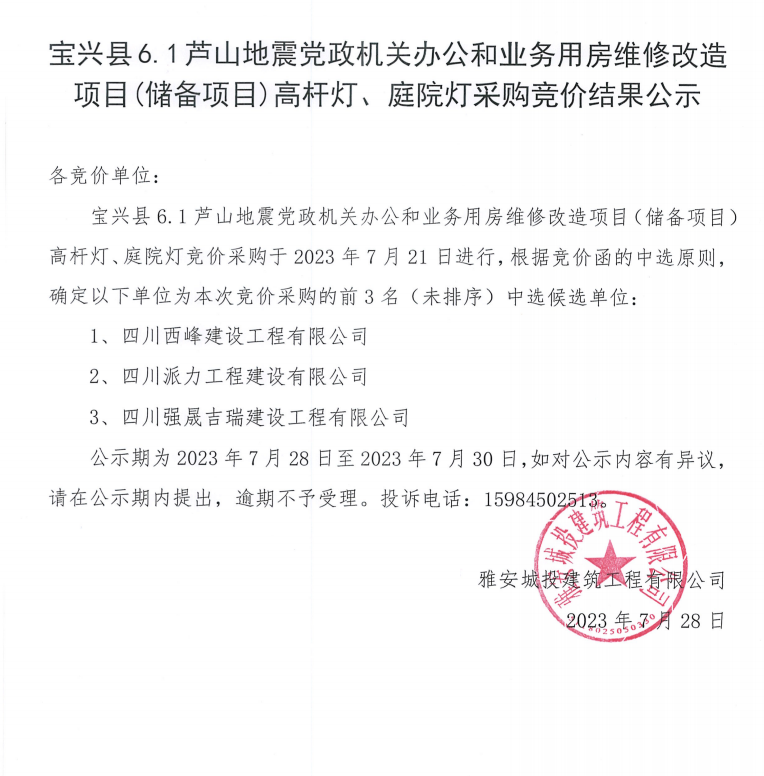 寶興縣6.1蘆山地震黨政機(jī)關(guān)辦公和業(yè)務(wù)用房維修改造項目(儲備項目)高桿燈、庭院燈采購競價結(jié)果公示