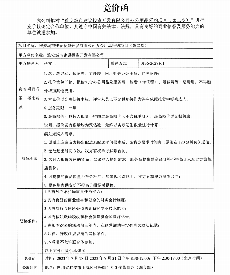 雅安城市建設(shè)投資開發(fā)有限公司辦公用品采購項(xiàng)目(第二次)競價(jià)公告