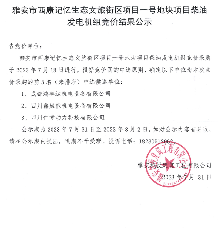 雅安市西康記憶生態(tài)文旅街區(qū)項目一號地塊項目柴油發(fā)電機組競價結(jié)果公示