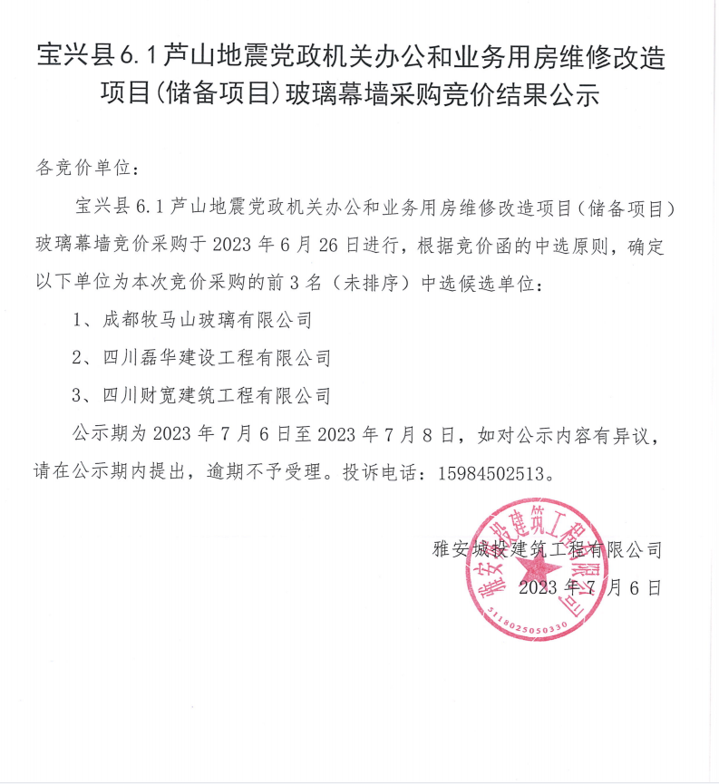 寶興縣6.1蘆山地震黨政機(jī)關(guān)辦公和業(yè)務(wù)用房維修改造項目(儲備項目)玻璃幕墻采購競價結(jié)果公示