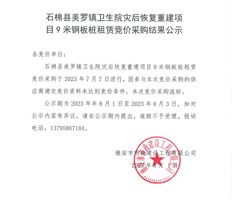 石棉縣美羅鎮(zhèn)衛(wèi)生院災(zāi)后恢復(fù)重建項(xiàng)目9米鋼板樁租賃競價(jià)采購結(jié)果公示