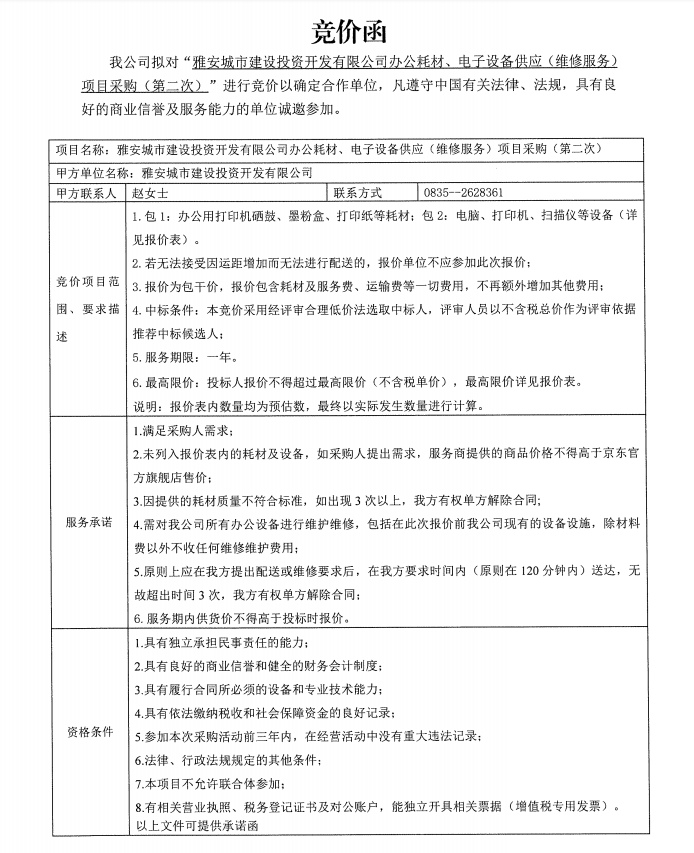 雅安城市建設投資開發(fā)有限公司辦公耗材、電子設備供應(維修服務)項目采購(第二次)公告