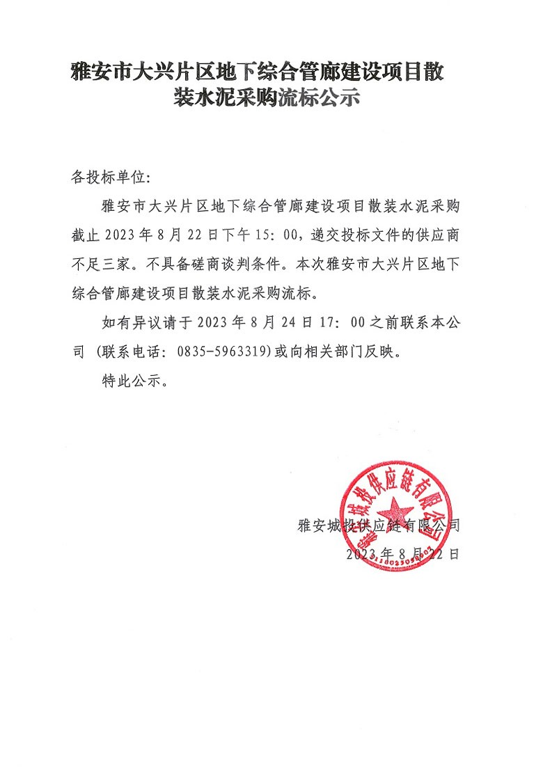雅安市大興片區(qū)地下綜合管廊建設(shè)項(xiàng)目散裝水泥采購(gòu)流標(biāo)公示