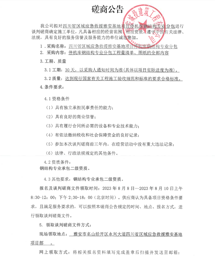 四川省區(qū)域應(yīng)急救援雅安基地項目停機庫鋼結(jié)構(gòu)專業(yè)分包談判磋商公告