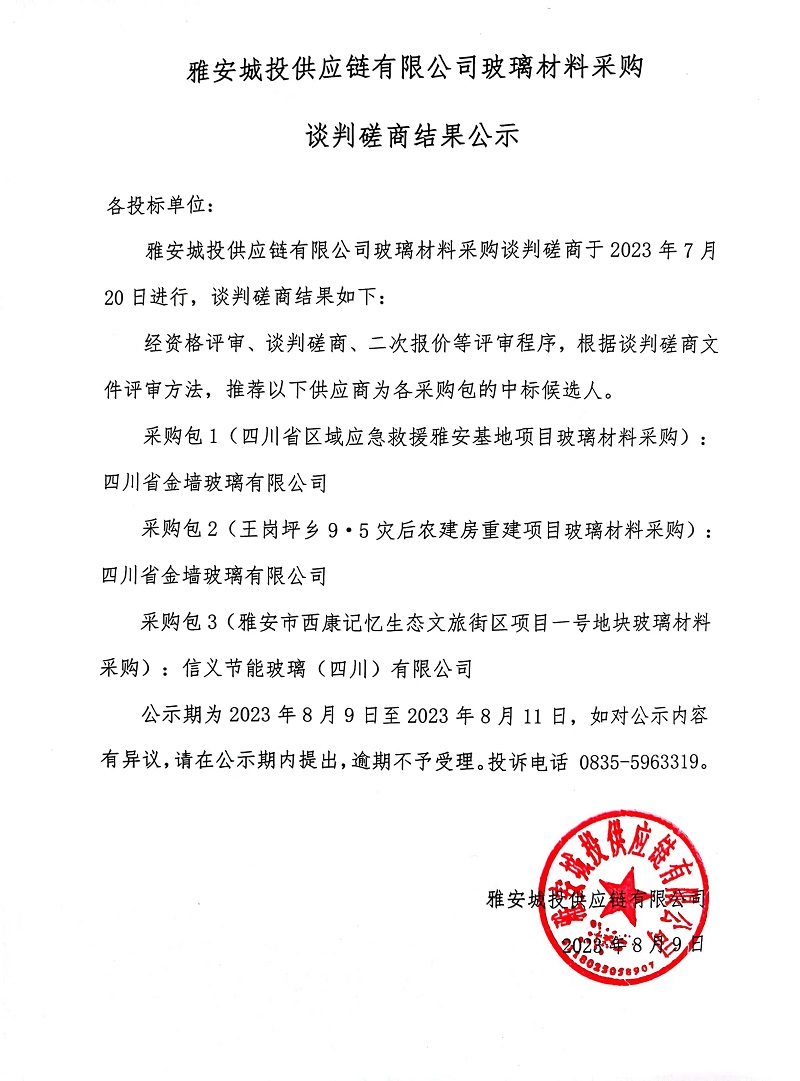 雅安城投供應鏈有限公司玻璃材料采購談判磋商結果公示