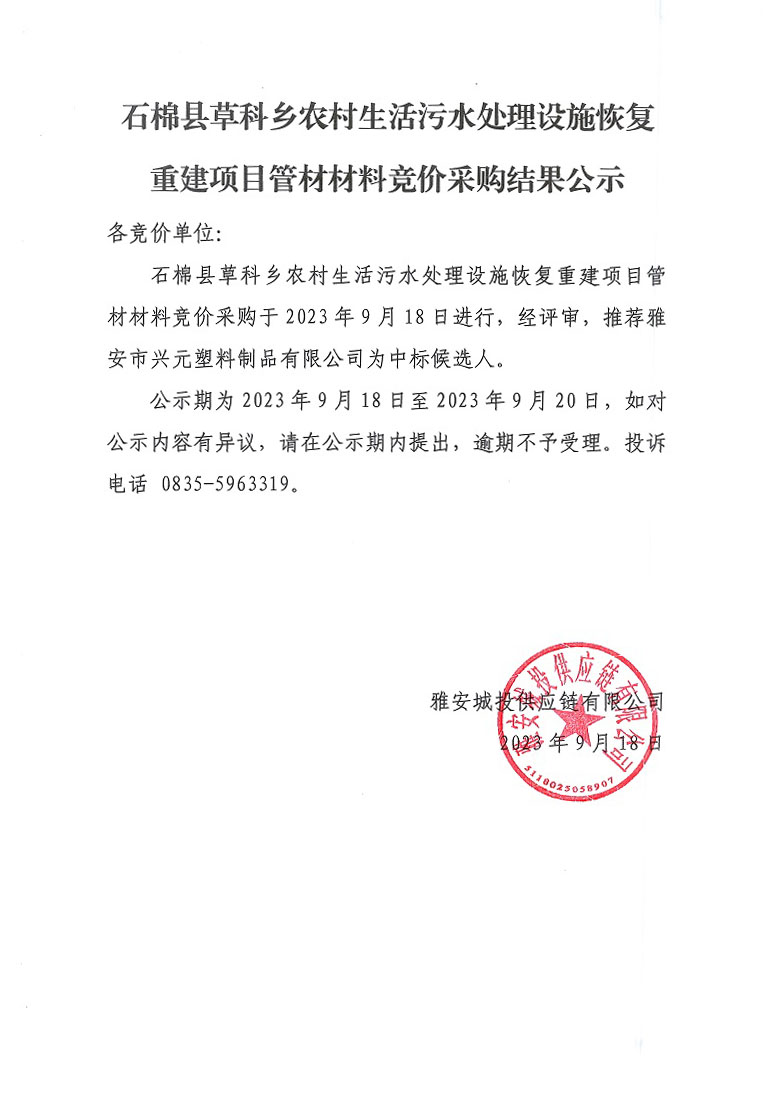 石棉縣草科鄉(xiāng)農(nóng)村生活污水處理設(shè)施恢復(fù)重建項(xiàng)目管材材料競(jìng)價(jià)采購結(jié)果公示