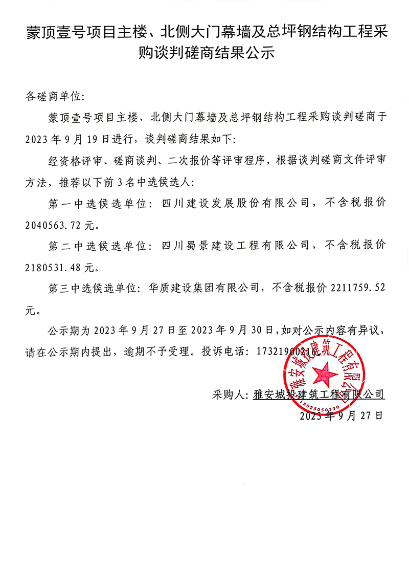 蒙頂壹號項目主樓、北側(cè)大門幕墻及總坪鋼結(jié)構(gòu)工程采購談判磋商結(jié)果公示
