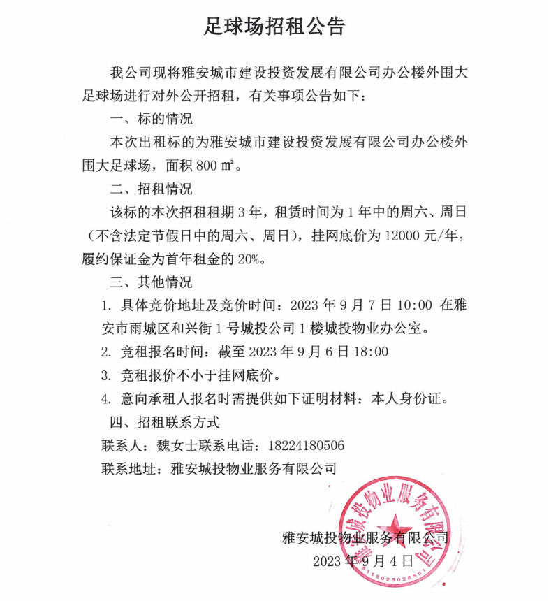 雅安城市建設(shè)投資開發(fā)有限公司外圍大足球場招租公告