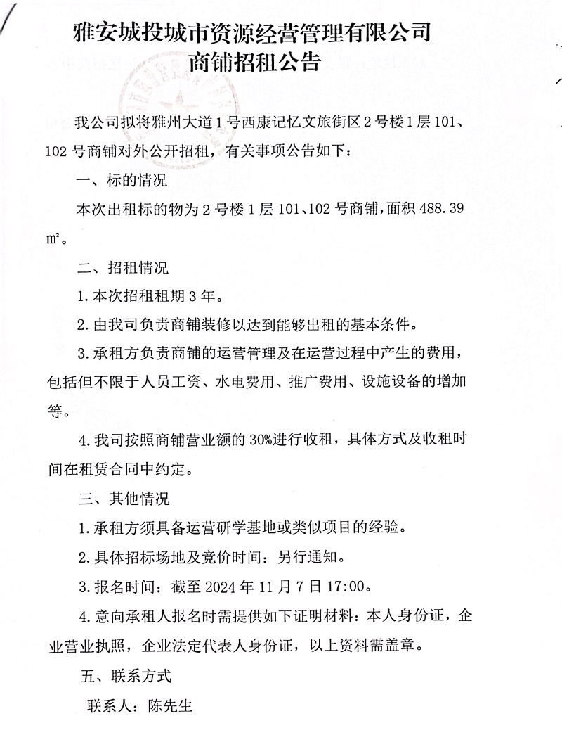 雅安城投城市資源經(jīng)營(yíng)管理有限公司雅州大道1號(hào)西康記憶文旅街區(qū)2號(hào)樓1層101、102號(hào)商鋪招租的公告