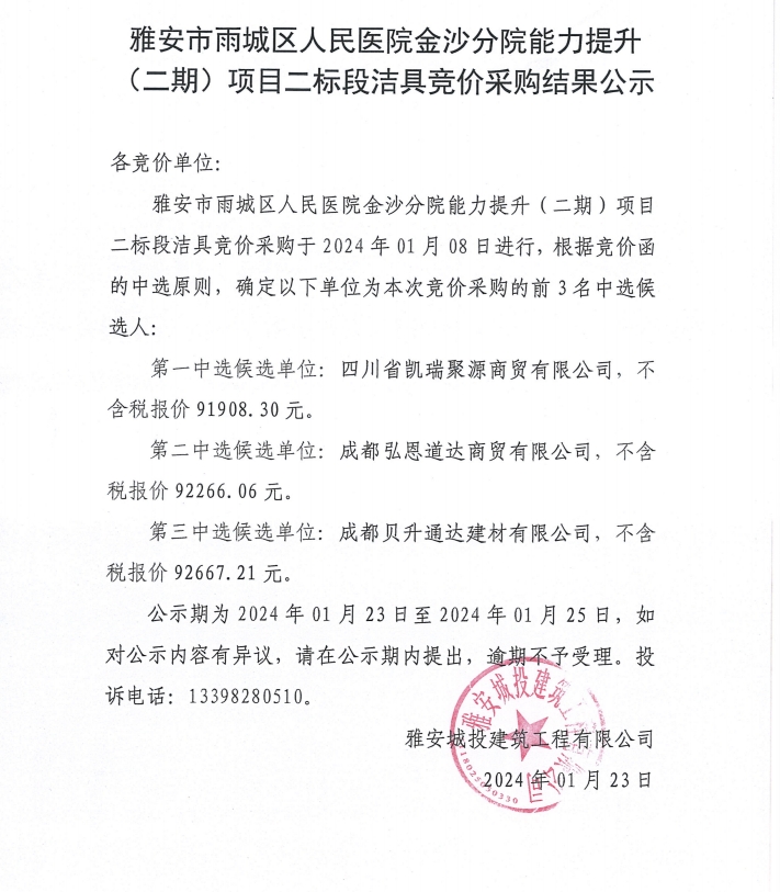 雅安市雨城區(qū)人民醫(yī)院金沙分院能力提升(二期)項目二標段潔具競價采購結(jié)果公示