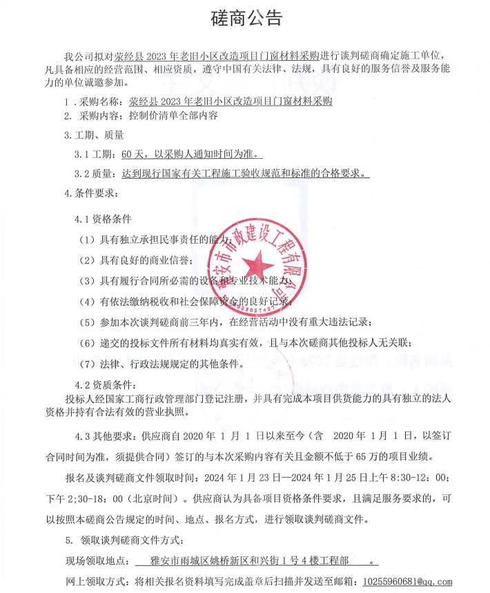 滎經(jīng)縣2023年老舊小區(qū)改造項目門窗材料采購談判磋商公告