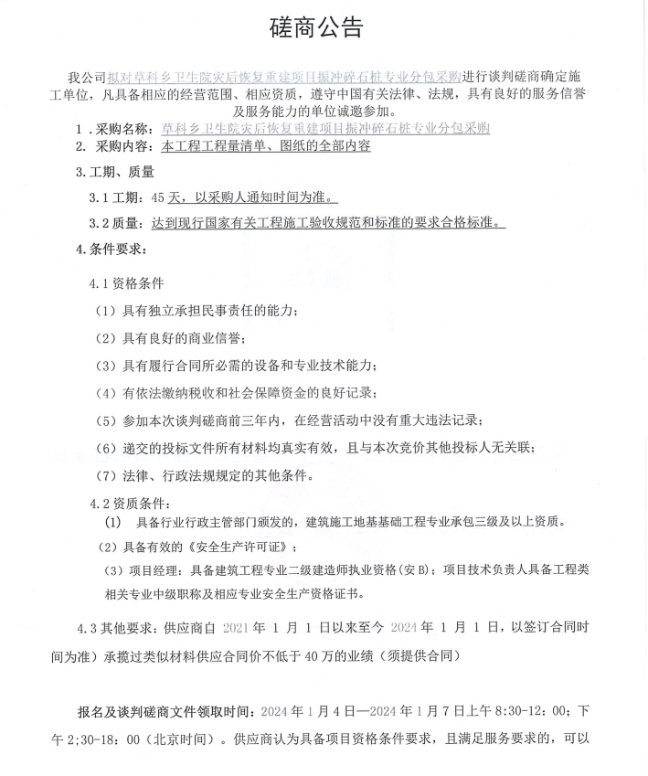 草科鄉(xiāng)衛(wèi)生院災(zāi)后恢復(fù)重建項(xiàng)目振沖碎石樁專業(yè)分包采購談判磋商公告