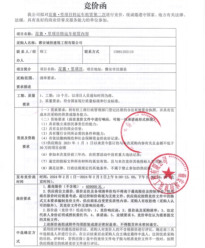花襄·里項目轉(zhuǎn)運車租賃(第二次)競價公告