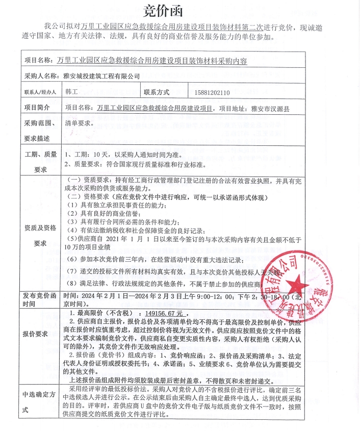萬里工業(yè)園區(qū)應(yīng)急救援綜合用房建設(shè)項目裝飾材料采購(第二次)競價公告