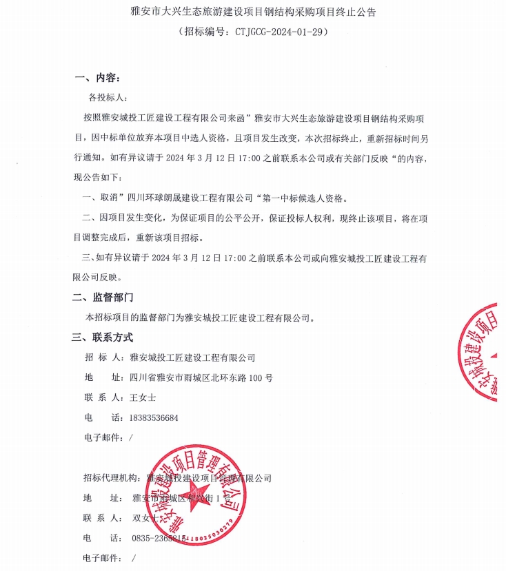 雅安市大興生態(tài)旅游建設(shè)項(xiàng)目鋼結(jié)構(gòu)采購(gòu)項(xiàng)目終止公告