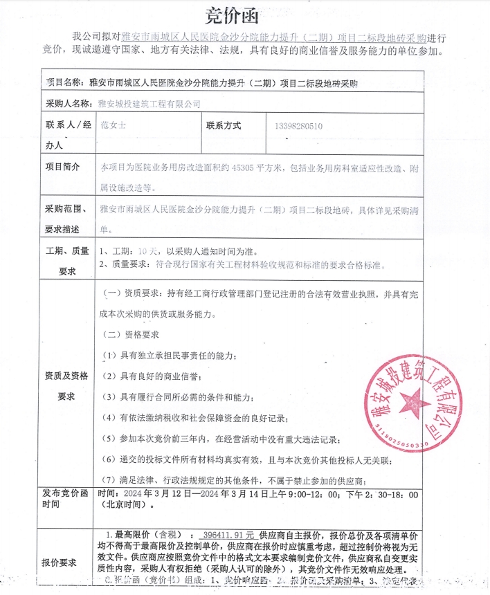 雅安市雨城區(qū)人民醫(yī)院金沙分院能力提升(二期)項目二標(biāo)段地磚采購競價公告