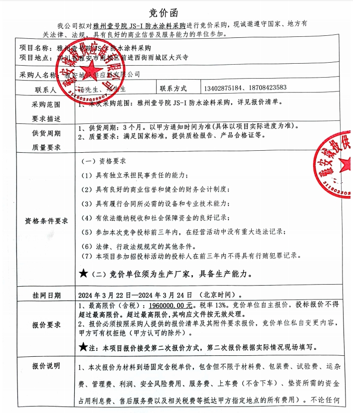 雅州壹號(hào)院JS-I防水涂料采購競(jìng)價(jià)公告