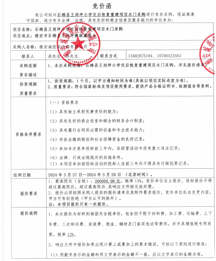石棉縣王崗坪小學(xué)災(zāi)后重建項目木門采購競價公告