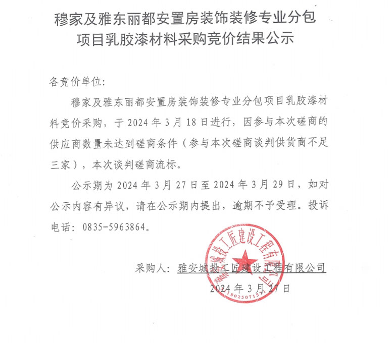 穆家及雅東麗都安置房裝飾裝修專業(yè)分包項(xiàng)目乳膠漆材料采購競價(jià)結(jié)果公示