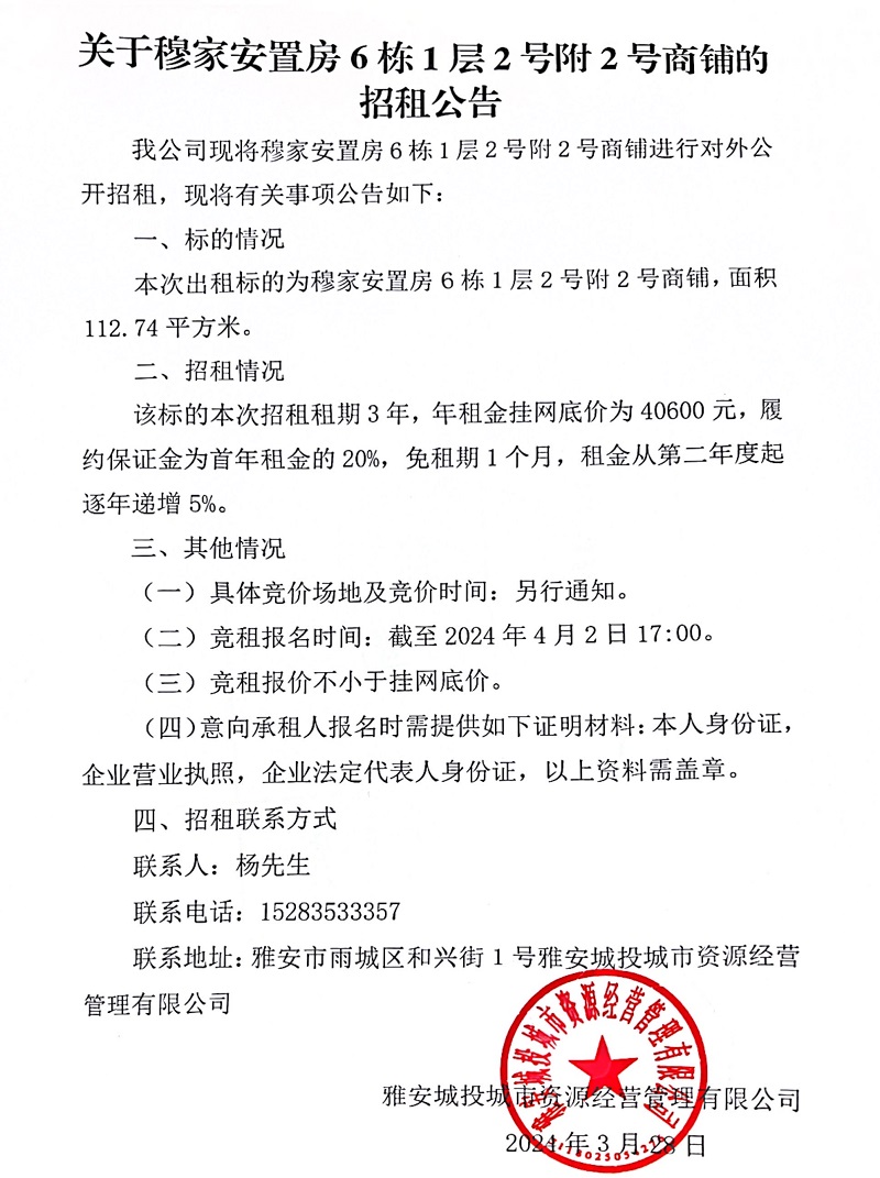 關(guān)于穆家安置房6棟1層2號附2號商鋪的招租公告