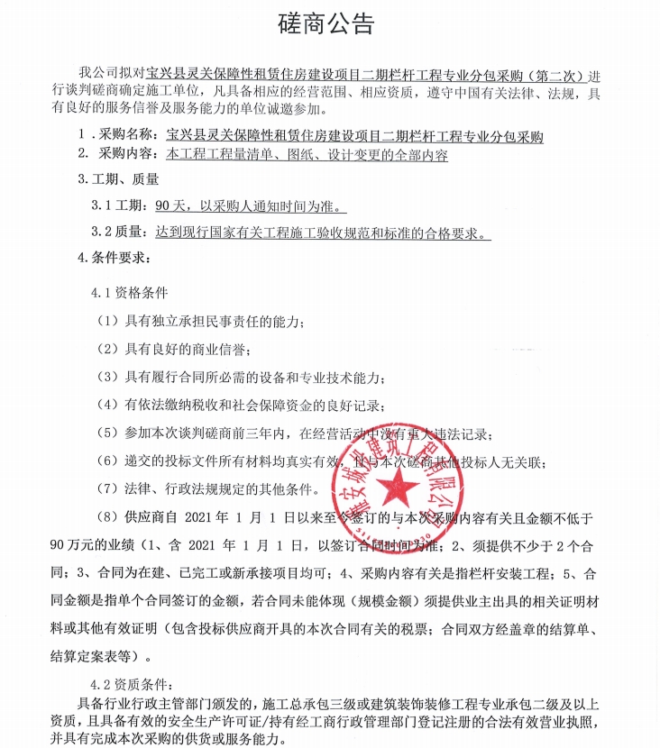 寶興縣靈關(guān)保障性租賃住房建設(shè)項(xiàng)目二期欄桿工程專業(yè)分包采購(第二次)磋商公告