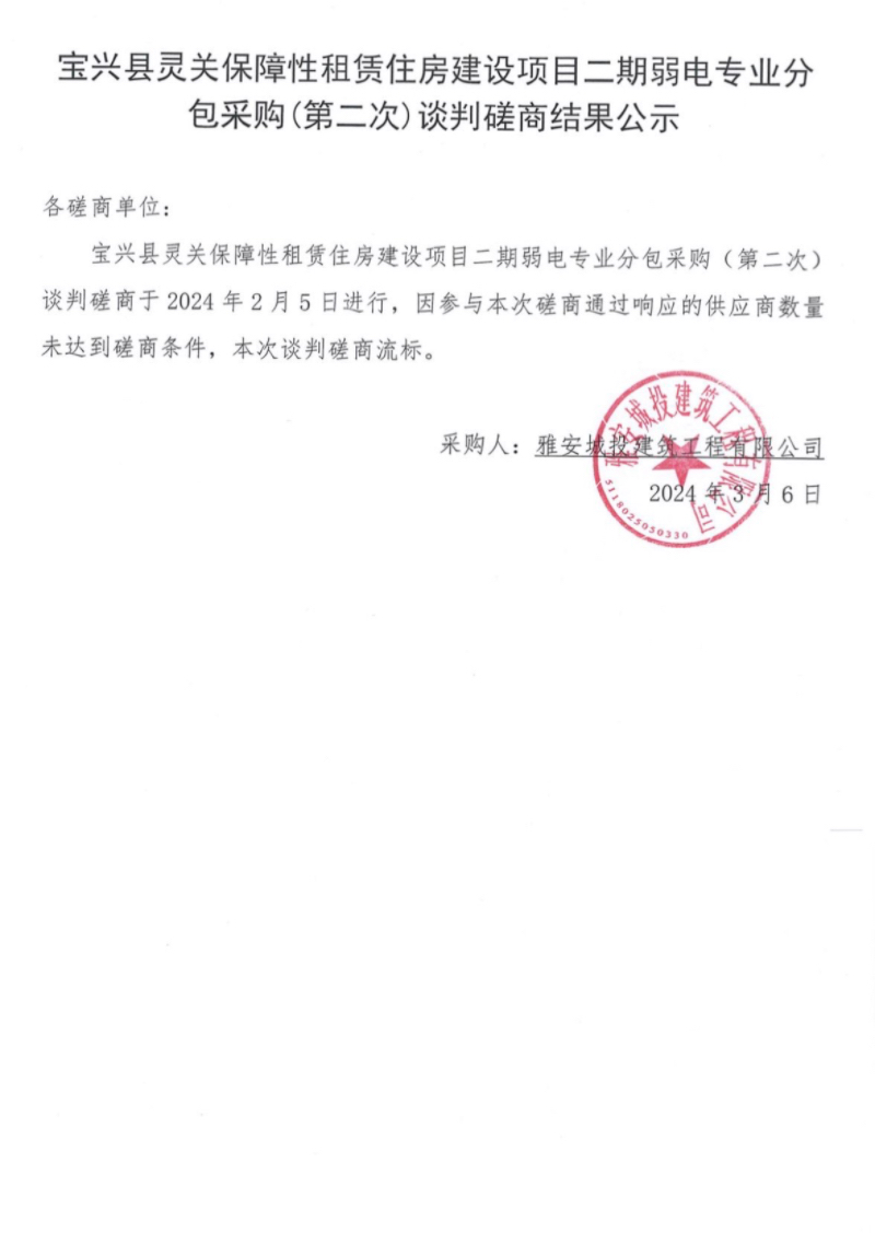 寶興縣靈關(guān)鎮(zhèn)保障性租賃住房建設(shè)項(xiàng)目二期弱電專業(yè)分包采購(第二次)談判磋商結(jié)果公示