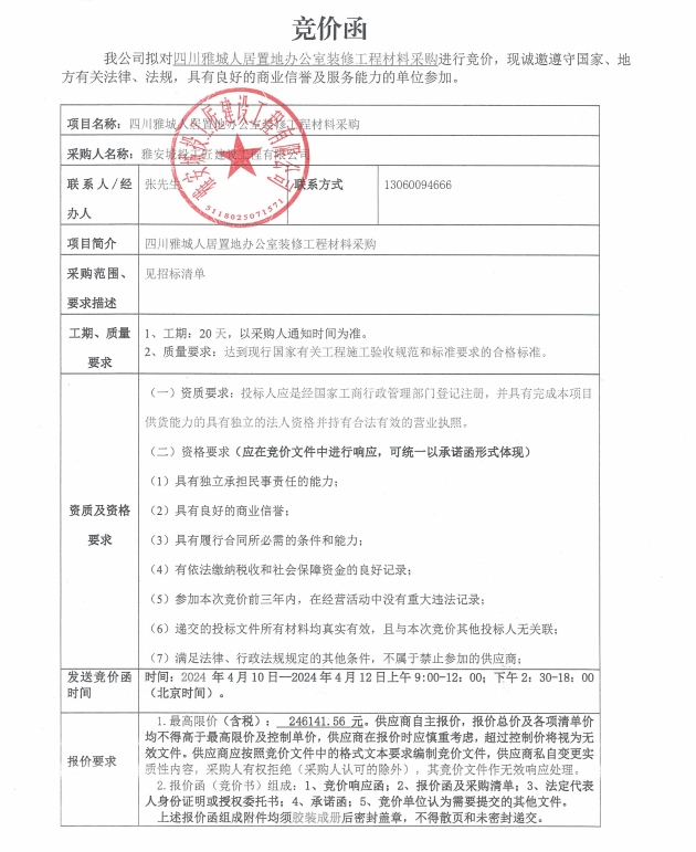 四川雅城人居置地辦公室裝修工程材料采購競價(jià)公告