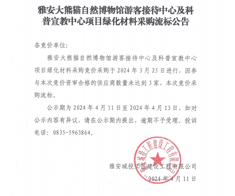 雅安大熊貓自然博物館游客接待中心及科普宣教中心項(xiàng)目綠化材料采購流標(biāo)公告