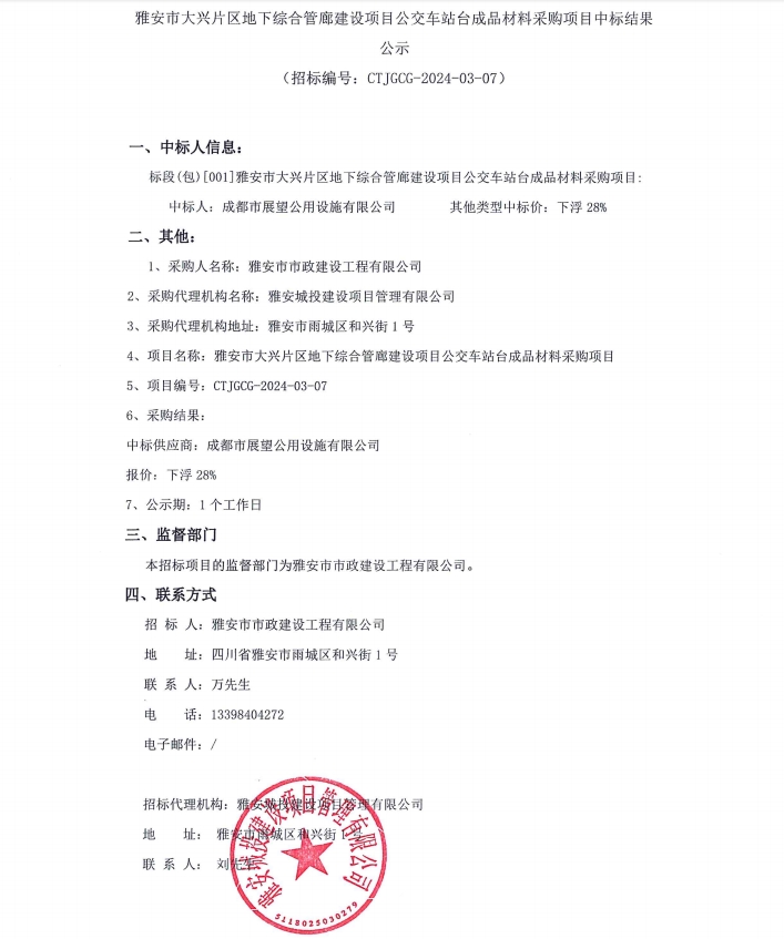 雅安市大興片區(qū)地下綜合管廊建設(shè)項目公交車站臺成品材料采購項目中標(biāo)結(jié)果公示