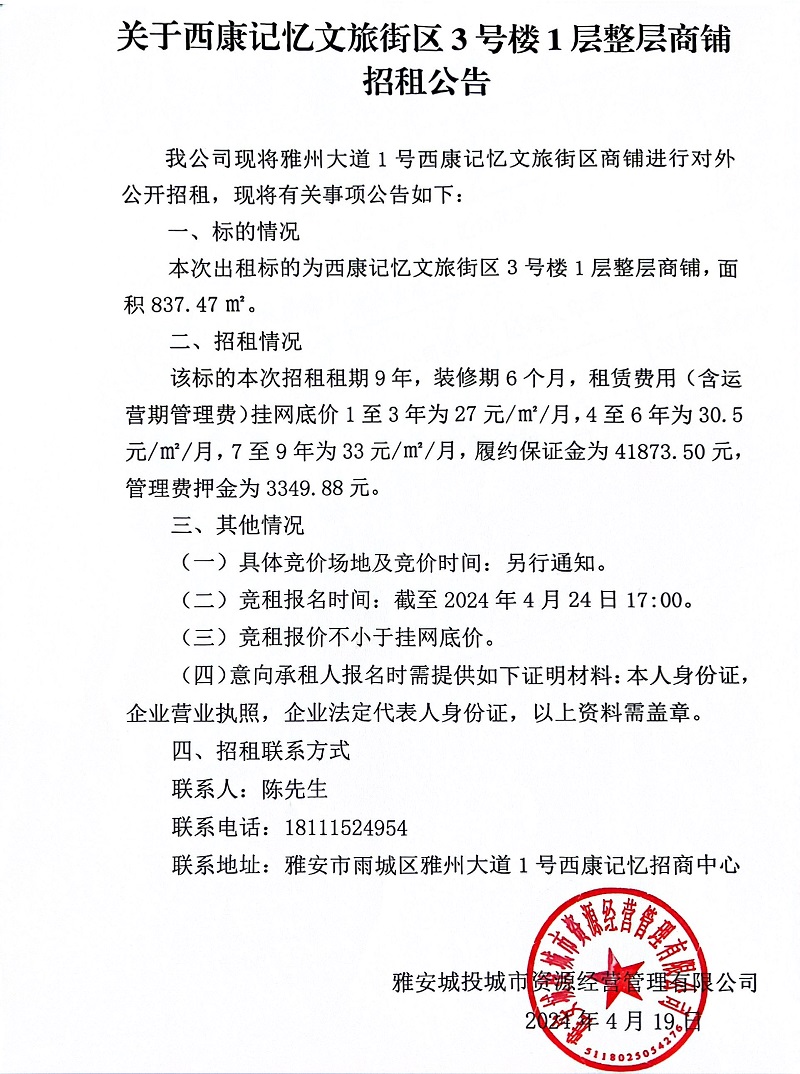 關(guān)于西康記憶文旅街區(qū)3號(hào)樓1層整層商鋪招租公告