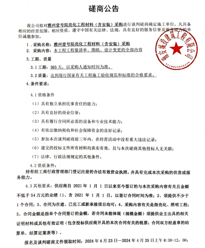 雅州壹號(hào)院亮化工程材料(含安裝)采購(gòu)磋商公告