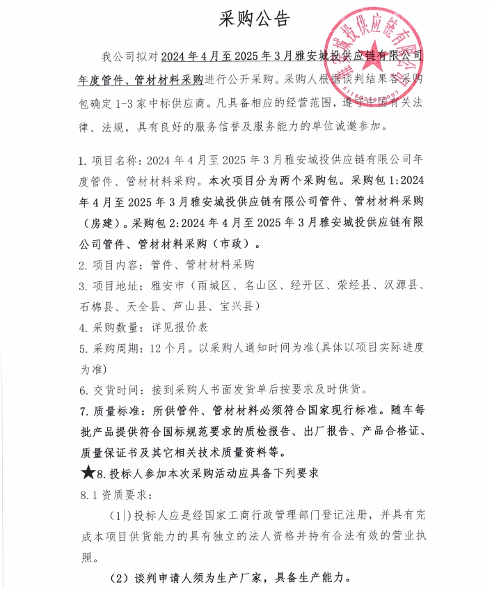 2024年4月至2025年3月雅安城投供應(yīng)鏈有限公司年度管件、管材材料采購公告