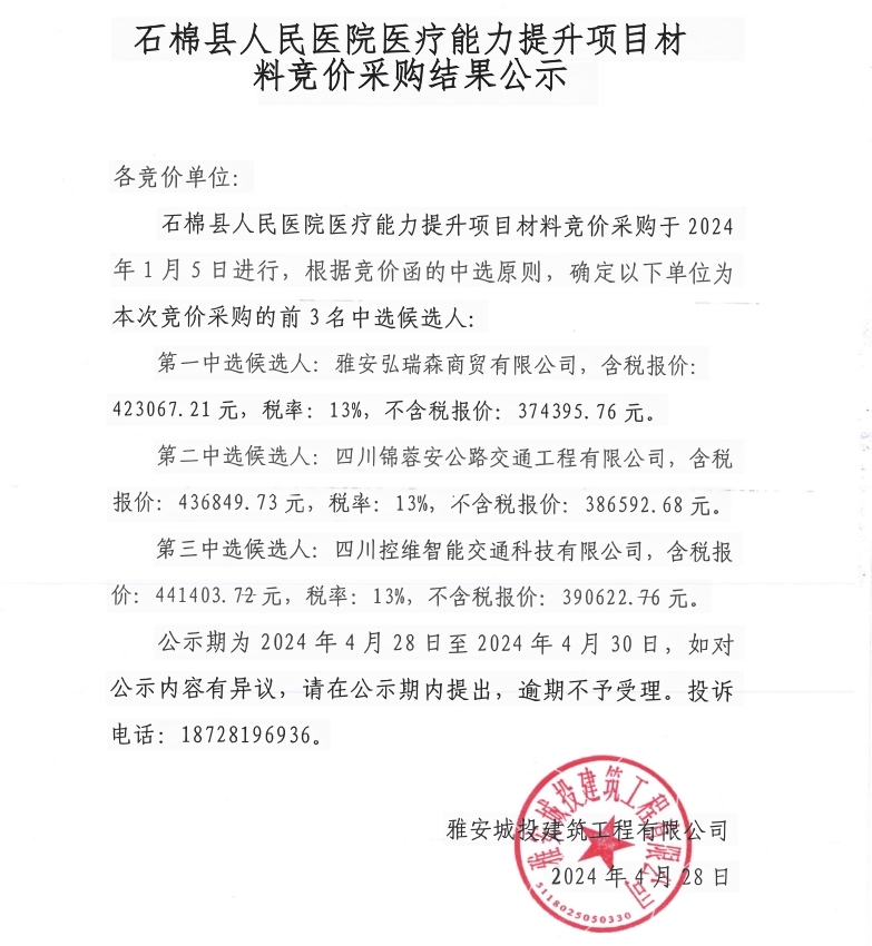石棉縣人民醫(yī)院醫(yī)療能力提升項(xiàng)目材料競(jìng)價(jià)采購結(jié)果公示