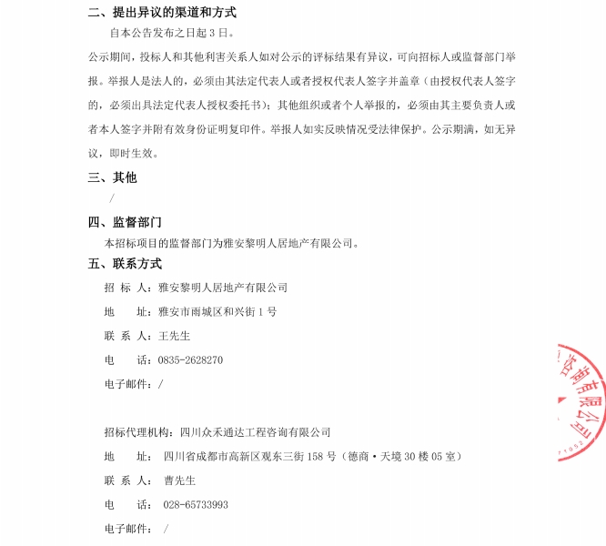 雅州壹號(hào)院臨時(shí)售樓部物業(yè)服務(wù)中標(biāo)候選人公示