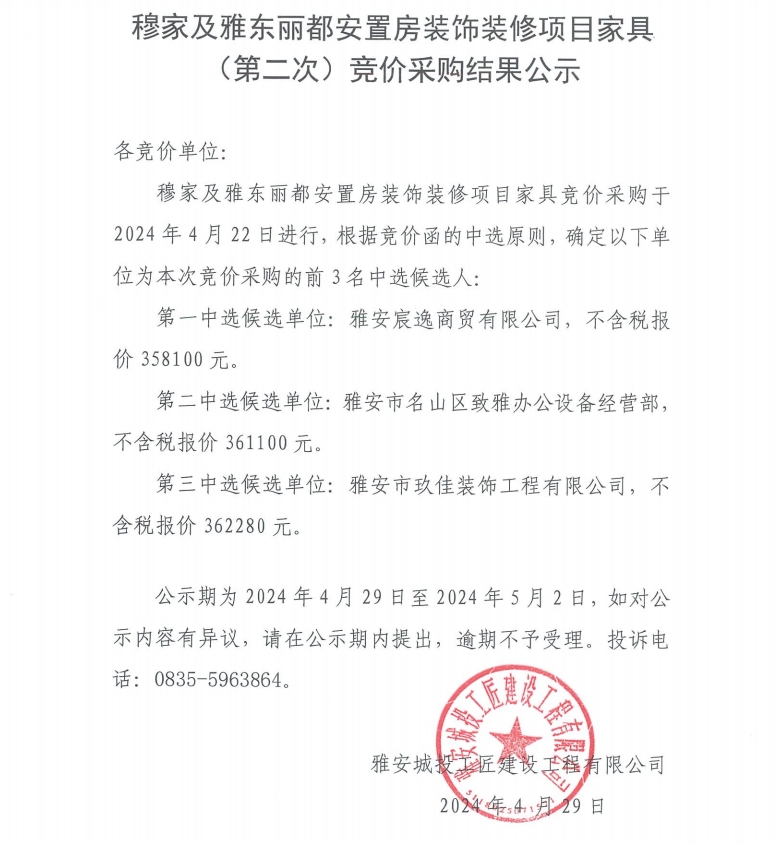 穆家及雅東麗都安置房裝飾裝修項目家具(第二次)競價采購結(jié)果公示