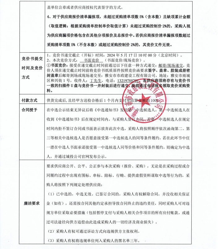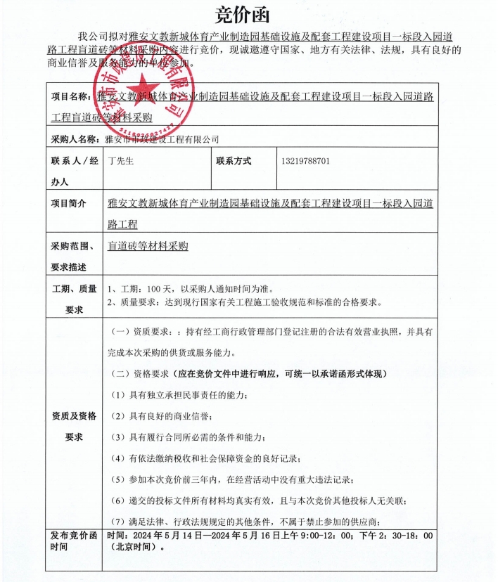 雅安文教新城體育產(chǎn)業(yè)制造園基礎(chǔ)設(shè)施及配套工程建設(shè)項(xiàng)目一標(biāo)段入園道路工程盲道磚等材料采購競(jìng)價(jià)公告