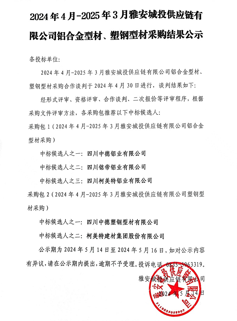 2024年4月-2025年3月雅安城投供應(yīng)鏈有限公司鋁合金型材、塑鋼型材采購結(jié)果公示