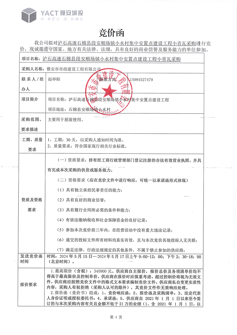 瀘石高速石棉縣段安順場(chǎng)鎮(zhèn)小水村集中安置點(diǎn)建設(shè)工程項(xiàng)目施工瓦片采購(gòu)競(jìng)價(jià)公告