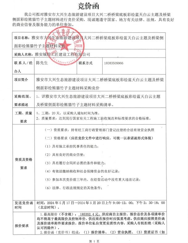 雅安市大興生態(tài)旅游建設(shè)項目大興二橋橋梁底板彩繪藍(lán)天白云主題及橋梁側(cè)面彩繪熊貓竹子主題材料采購競價公告