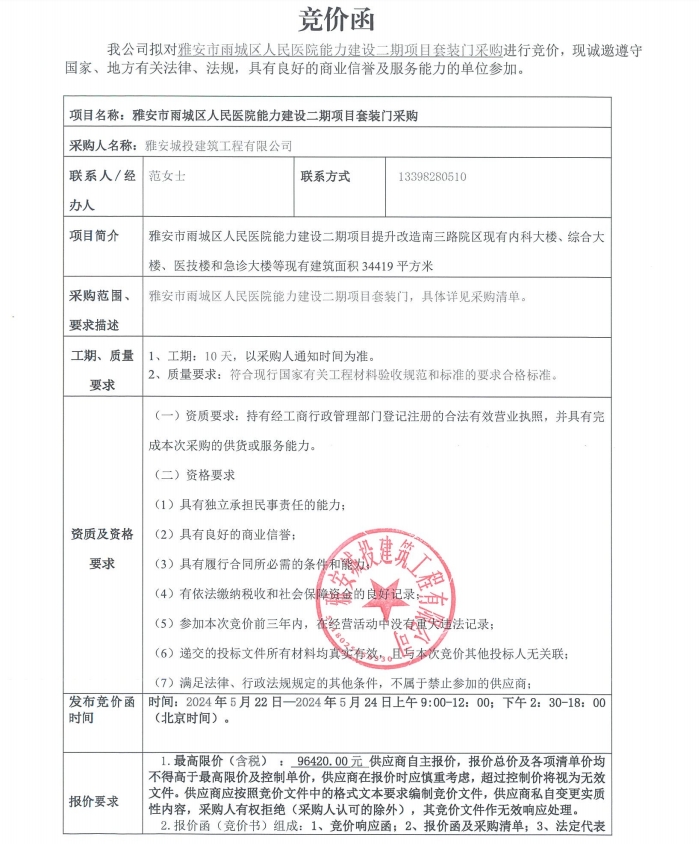 雅安市雨城區(qū)人民醫(yī)院能力建設(shè)二期項(xiàng)目套裝門采購(gòu)競(jìng)價(jià)公告