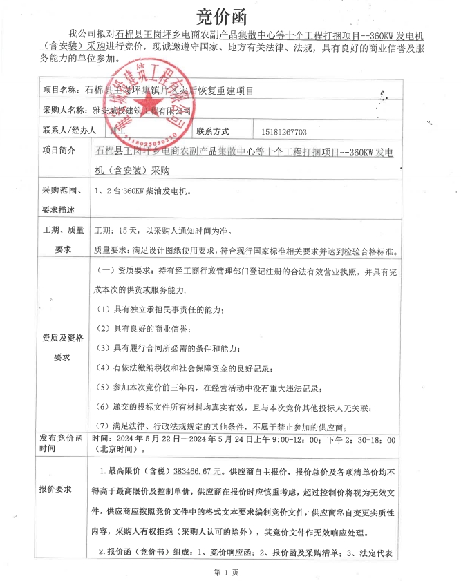 石棉縣王崗坪鄉(xiāng)電商農(nóng)副產(chǎn)品集散中心等十個工程打捆項目--360KW發(fā)電機(含安裝)采購競價公告