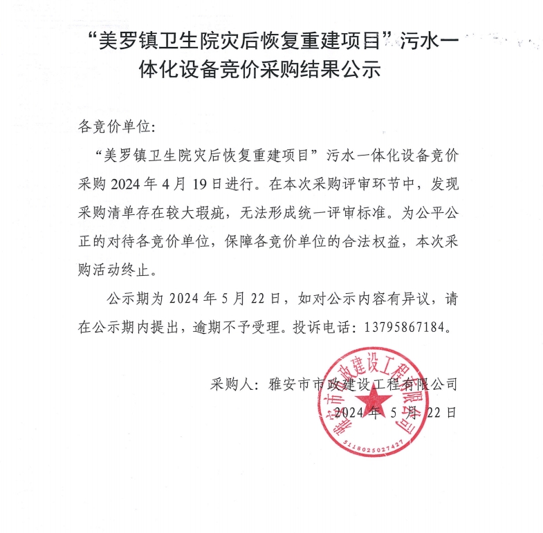 美羅鎮(zhèn)衛(wèi)生院災(zāi)后恢復(fù)重建項(xiàng)目污水一體化設(shè)備競(jìng)價(jià)采購(gòu)結(jié)果公示