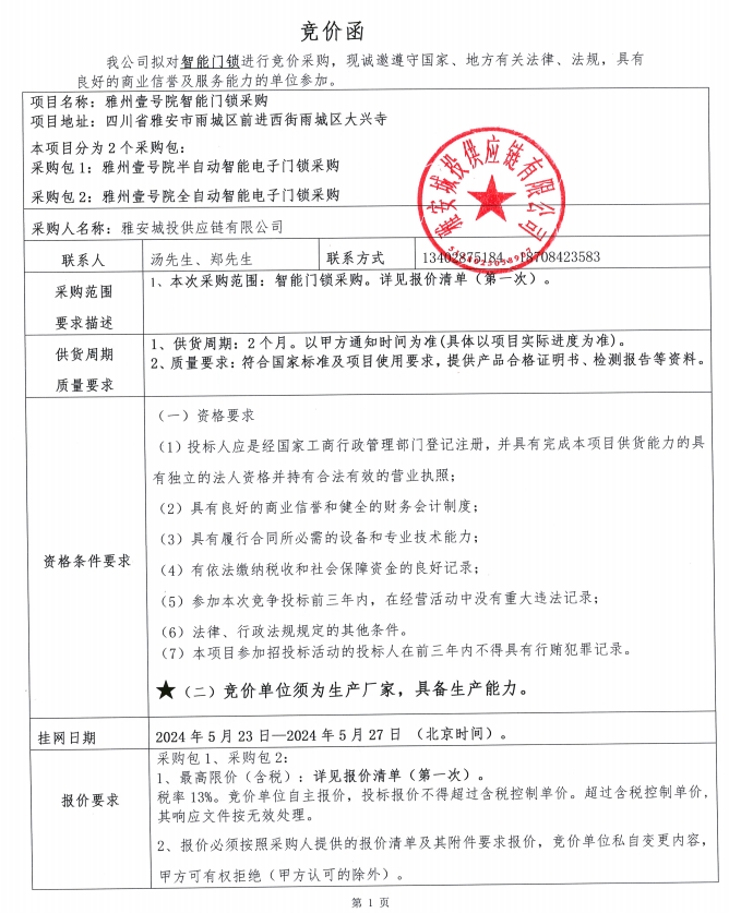 附件1:競價函--雅州壹號院智能門鎖采購
