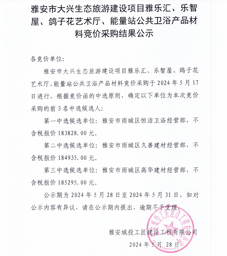 雅安市大興生態(tài)旅游建設(shè)項(xiàng)目雅樂匯、樂智屋、鴿子花藝術(shù)廳、能量站公共衛(wèi)浴材料競價采購結(jié)果公示