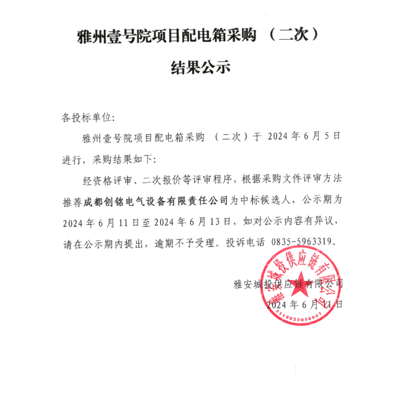 雅州壹號(hào)院項(xiàng)目配電箱采購(二次)結(jié)果公示