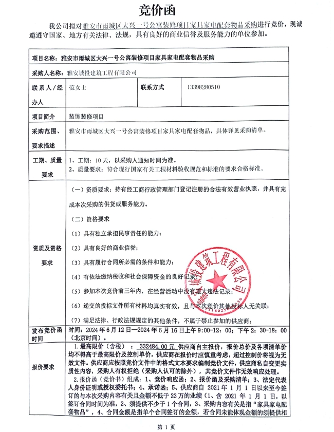 雅安市雨城區(qū)大興壹號(hào)公寓裝修項(xiàng)目家具電配套物品采購競(jìng)價(jià)公告