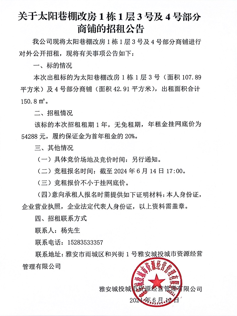 關(guān)于太陽巷棚改房1棟1層3號(hào)及4號(hào)部分商鋪的招租公告
