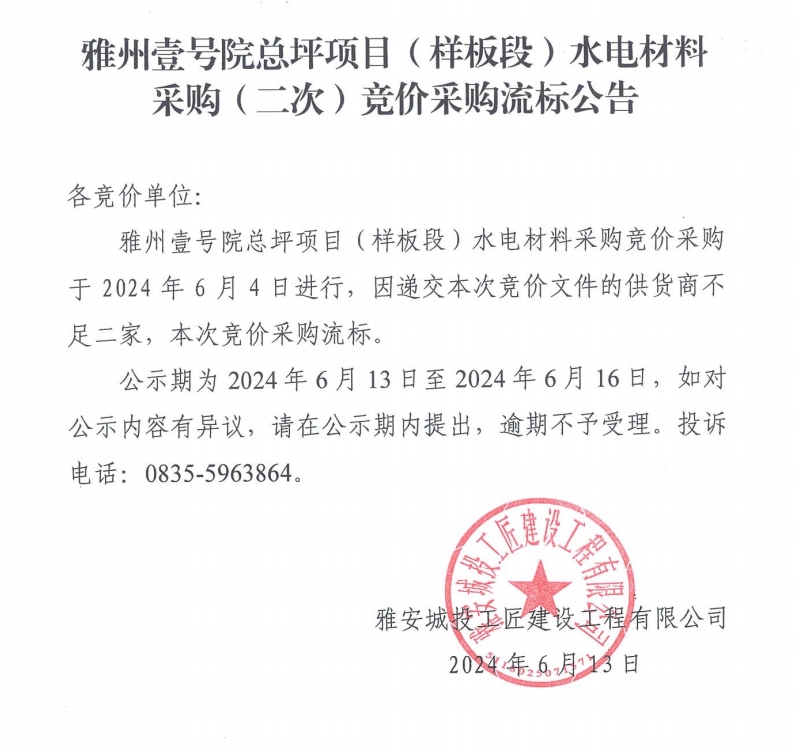 雅州壹號院總坪項目(樣板段)水電材料采購(二次)競價采購流標(biāo)公告