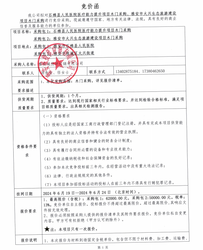 石棉縣人民醫(yī)院醫(yī)療能力提升項目木門采購、雅安市大興生態(tài)旅游建設項目木門采購競價公告